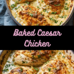 Baked Caesar Chicken is a rich, creamy, and easy-to-make dish featuring juicy chicken breasts smothered in Caesar dressing and parmesan cheese, perfect for weeknights or meal prep.