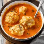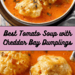 A rich, creamy homemade tomato soup with fluffy, cheesy Cheddar Bay-style dumplings. This cozy, one-pot vegetarian dish blends bold tomato flavor with herb-loaded dumplings for the ultimate comfort food experience.