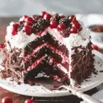 A rich and indulgent German dessert made with layers of moist chocolate cake, tart cherry filling, and fluffy whipped cream, finished with chocolate shavings and whole cherries for a stunning presentation.
