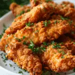 Golden, juicy chicken tenders marinated in tangy buttermilk, dredged in seasoned flour, and fried until irresistibly crispy—this classic Southern comfort dish is simple, flavorful, and perfect for any occasion.