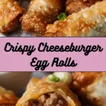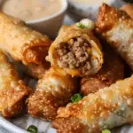 Crispy egg rolls filled with seasoned ground beef, melty cheese, and classic cheeseburger flavors, fried or air fried until golden and crunchy.