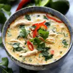 A rich, creamy Thai-inspired crockpot soup made with tender shredded chicken, coconut milk, fresh vegetables, and bold flavors like red curry, ginger, and lime. Perfect for a cozy, nourishing, and low-effort meal.
