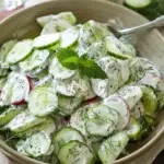 A cool, crisp, and refreshing creamy cucumber salad made with thinly sliced cucumbers tossed in a tangy sour cream and dill dressing. This simple side dish is perfect for warm days and pairs beautifully with grilled meats, sandwiches, or light lunches.