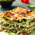 A rich and comforting vegetarian lasagna layered with tender noodles, garlicky mushrooms, creamy white sauce, and hearty spinach. A perfect meatless dish full of flavor and comfort.