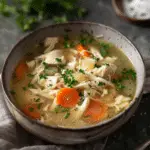 A light yet comforting chicken soup with ginger, garlic, and lemon that feels soothing and nourishing. Perfect for a simple meal that is both cozy and refreshing.