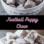 A sweet and crunchy game-day snack mix, this Football Puppy Chow is the perfect blend of classic muddy buddies and festive football-themed touches. With chocolate, peanut butter, powdered sugar, and playful candy mix-ins, it’s an irresistible treat I always love to serve during tailgates, game nights, or Super Bowl parties.