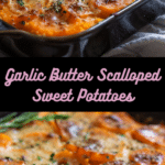 These garlic butter scalloped sweet potatoes are a rich and comforting side dish featuring thinly sliced sweet potatoes baked in a garlicky cream sauce with fresh thyme and topped with golden, melted Parmesan cheese. Perfect for holidays or weeknight meals.
