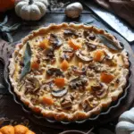A cozy, savory tart featuring creamy pumpkin purée, earthy mushrooms, and fragrant sage in a buttery homemade crust. Perfect for autumn gatherings, brunch, or a vegetarian dinner.