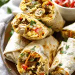 A hearty and protein-packed breakfast burrito filled with scrambled eggs, black beans, veggies, and cheese wrapped in a whole wheat tortilla. Perfect for meal prep or a quick, satisfying morning meal.