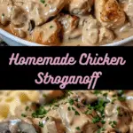 Homemade Chicken Stroganoff is a creamy, comforting dish made with tender chicken strips, sautéed mushrooms, and a rich sour cream sauce, served over egg noodles, rice, or mashed potatoes for a satisfying family-friendly meal.
