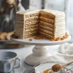 A rich and tender layered honey cake with delicate baked layers and a lightly tangy sour cream frosting. It becomes softer and more flavorful after resting, making it perfect for special occasions.