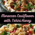 A vibrant Moroccan-inspired roasted cauliflower dish topped with a creamy tahini-honey sauce. Warm spices, citrus, and a touch of sweetness make it a flavorful side or light plant-based main.