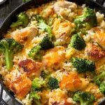 A creamy, comforting one-pan meal made with tender chicken, fluffy rice, fresh broccoli, and melted cheddar cheese, all cooked together in a single skillet for an easy and satisfying dinner.