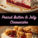 A rich and creamy Peanut Butter & Jelly Cheesecake with a graham cracker crust, smooth peanut butter filling, and swirled fruity jam topping—combining childhood nostalgia with indulgent elegance.