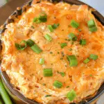 Once it is ready, I garnish it with chopped green onions or parsley if I want a fresh finish. I serve it hot with tortilla chips, celery sticks, crackers, or toasted baguette slices.