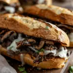 Tender chuck roast slow-cooked in a savory broth, piled onto toasted hoagie rolls, topped with garlicky sautéed mushrooms, and served with rich au jus for dipping. These Slow Cooker French Dip Sandwiches are a hearty, comforting meal perfect for cozy nights or gatherings.