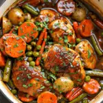 Tender chicken thighs, baby potatoes, and carrots slow-cooked in a sweet and savory honey garlic sauce — an easy, comforting one-pot meal perfect for busy weeknights or cozy weekends.