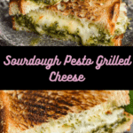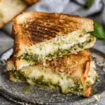 Golden sourdough bread crisped to perfection, oozing with melty mozzarella and sharp white cheddar, brightened with fresh basil pesto—this grilled cheese sandwich is an elevated twist on classic comfort food that’s quick and satisfying.