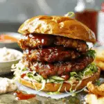 I store leftover fried chicken in an airtight container in the fridge for up to 3 days (before glazing it). To reheat and keep the crispiness, I pop the chicken into a 375°F (190°C) oven or air fryer for about 8–10 minutes. The sticky sauce can be kept in a sealed jar in the fridge for up to a week and gently reheated before using. I always assemble the burgers fresh for the best texture.