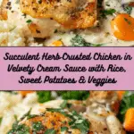 Succulent Herb‑Crusted Chicken in Velvety Cream Sauce with Rice, Sweet Potatoes & Veggies