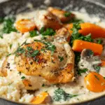 This herb-crusted chicken in cream sauce has become one of my go-to meals for when I want something comforting, balanced, and flavorful. I love how the textures and flavors come together on one plate—tender chicken, creamy sauce, sweet potatoes, fluffy rice, and vibrant veggies. It’s a satisfying dinner that feels special but is easy enough to make on a weeknight.