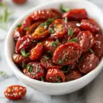 These oven-roasted sun-dried cherry tomatoes are chewy, tangy, and packed with concentrated flavor. They’re a simple, low-effort way to preserve the taste of summer and can be used in a variety of dishes like pasta, salads, or sandwiches.