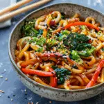 Thick, chewy udon noodles stir-fried with colorful vegetables and coated in a rich, umami-forward sauce — this dish is the perfect example of Japanese comfort food that I can whip up in just 25 minutes. Whether I keep it vegetarian or add some protein, it always hits the spot with its savory depth and satisfying texture.